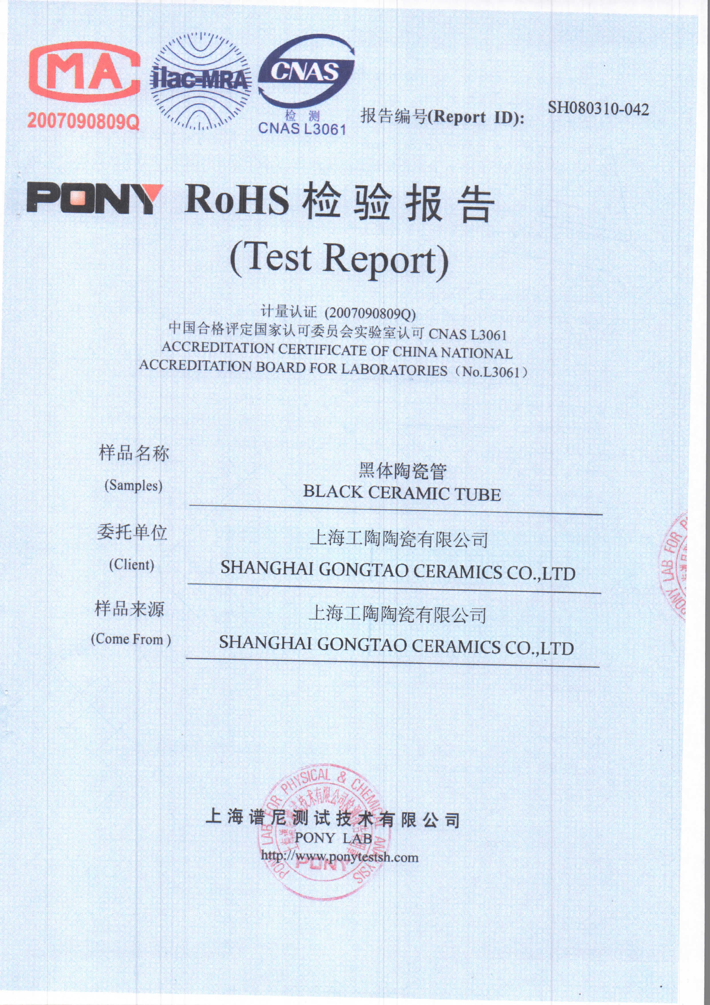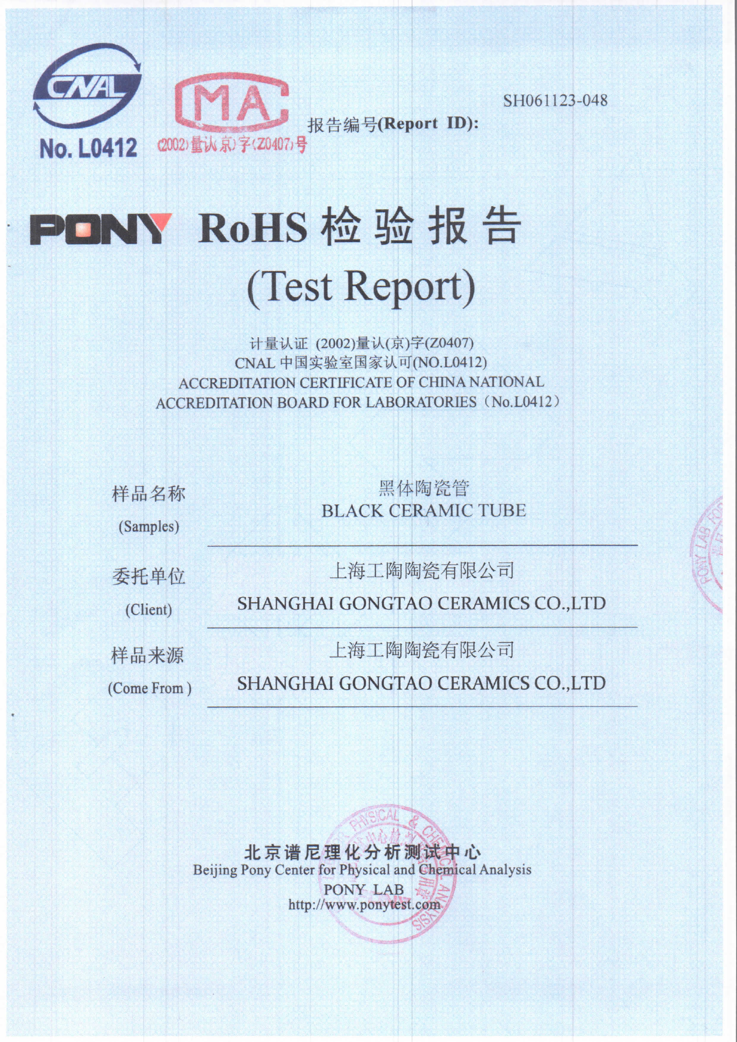 工陶产品检验报告-黑体陶瓷管