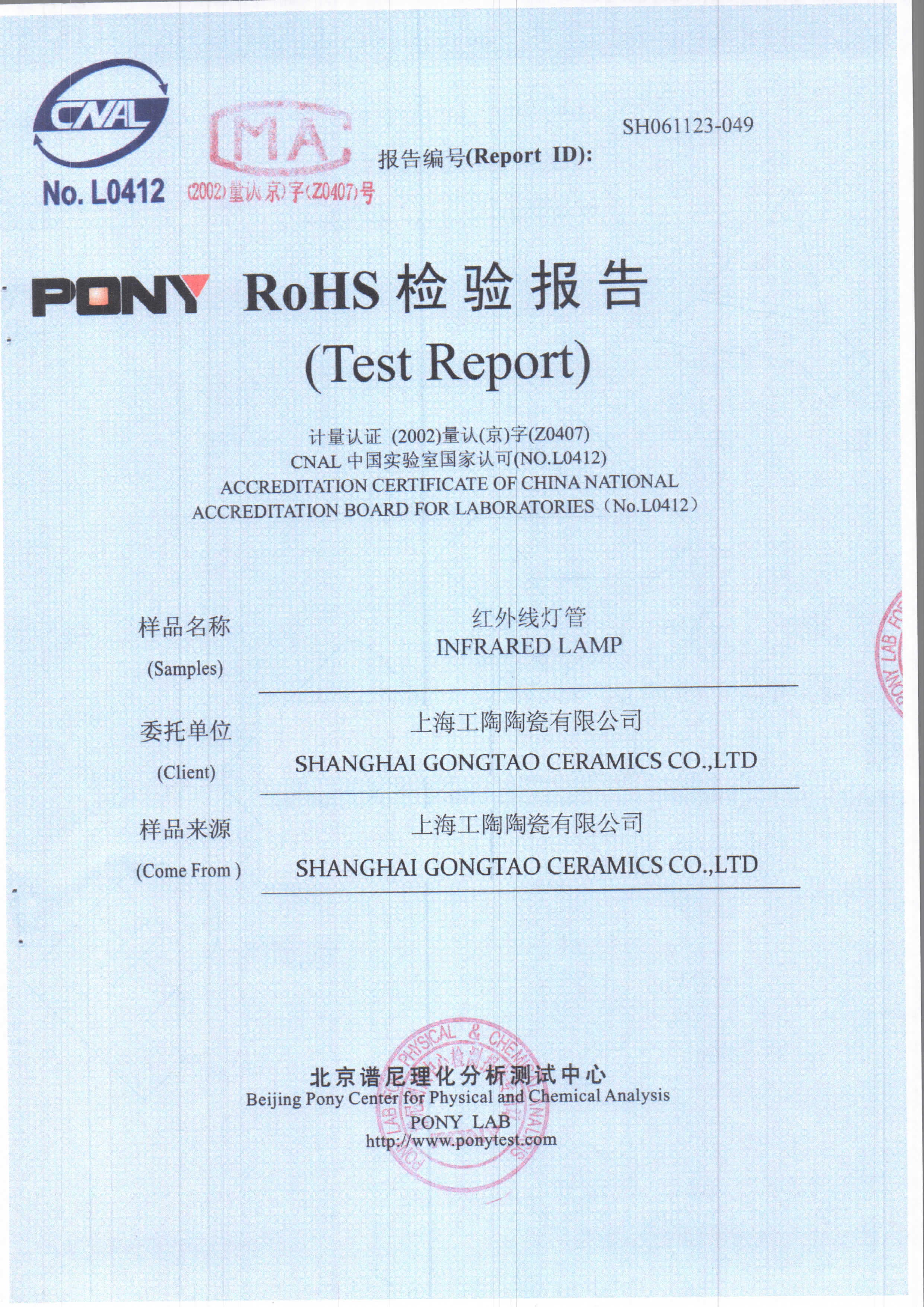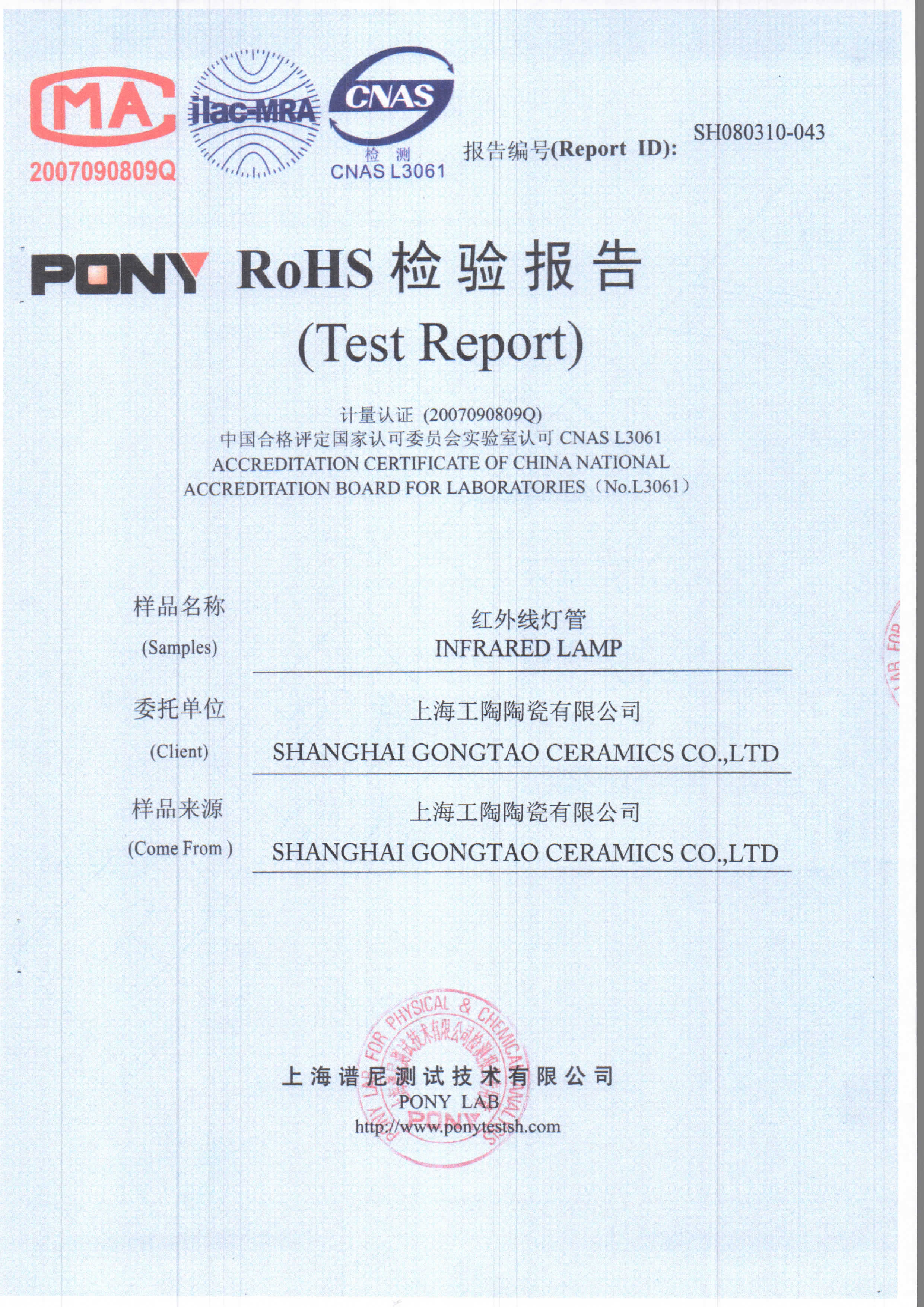 工陶产品检验报告-红外线灯管
