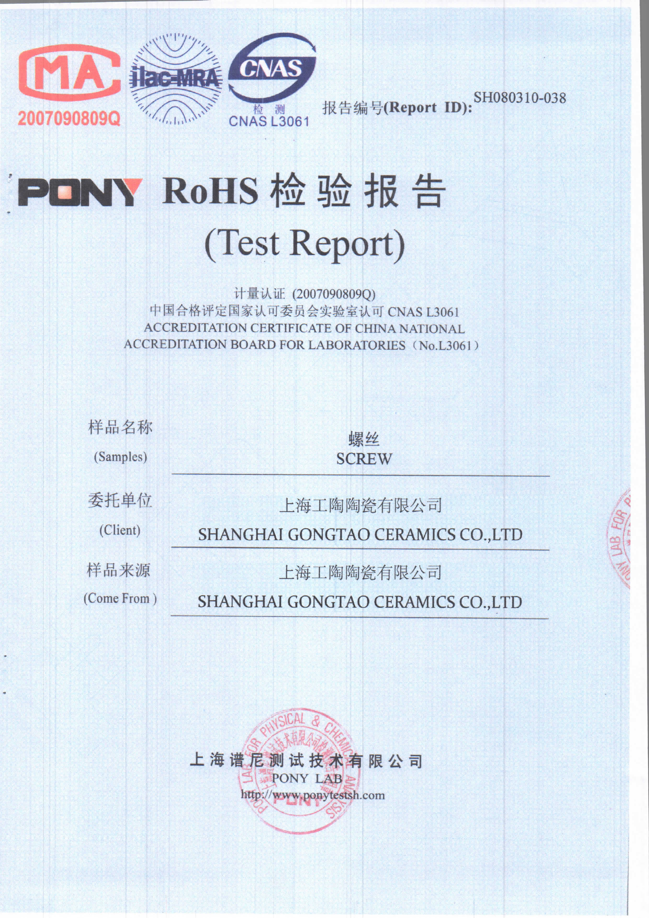 工陶产品检验报告-螺丝