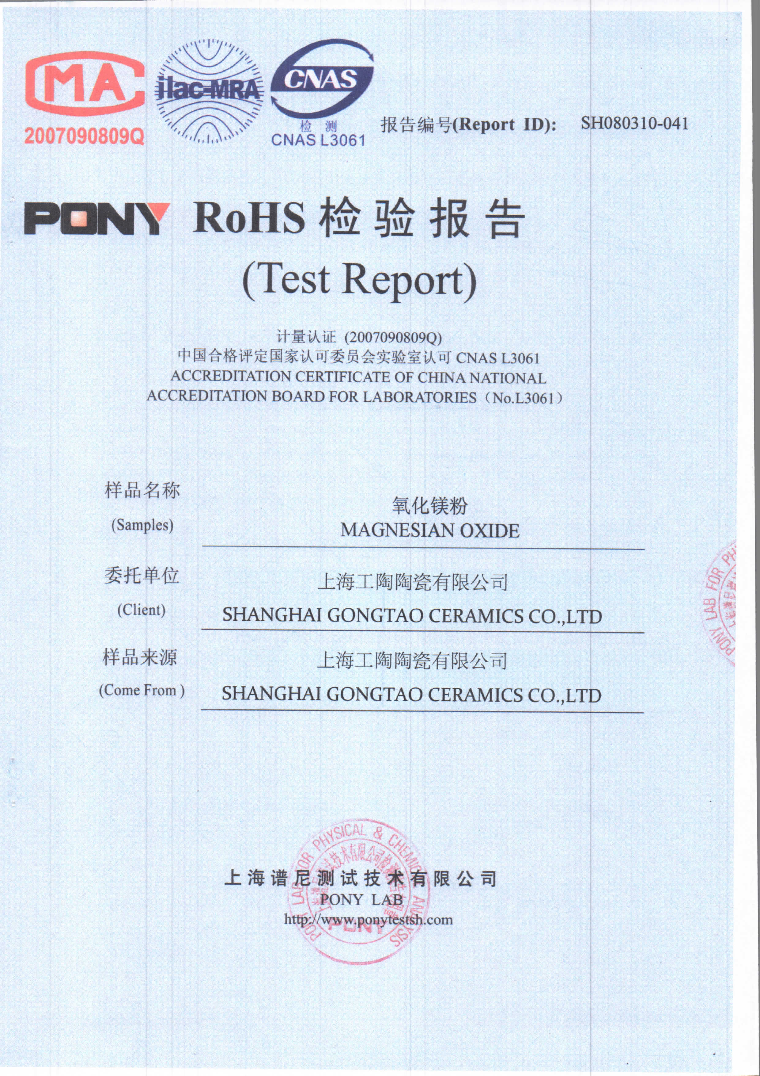 工陶产品检验报告-氧化镁粉